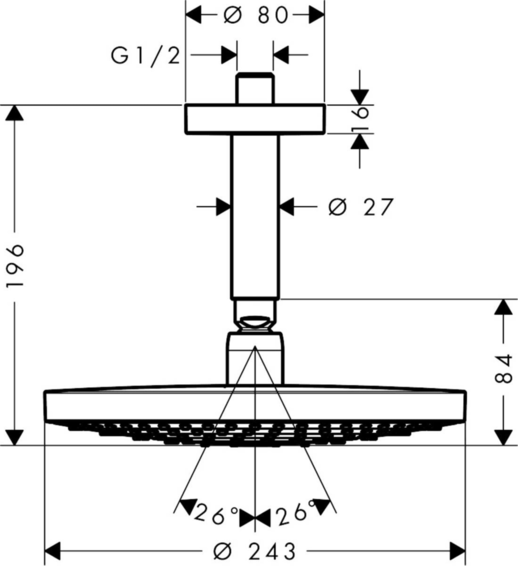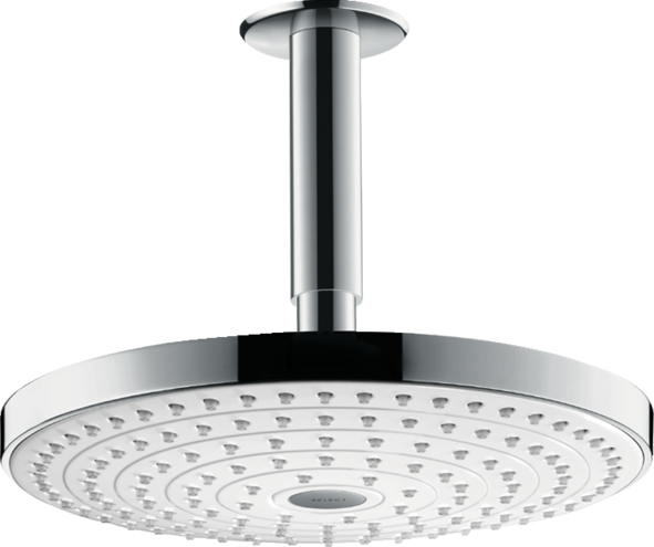Верхний душ 240 2jet с потолочным подсоединением состоит из верхнего душа, потолочное подсоединение, размер душевого диска: 243 мм, тип струи: RainAir, Rain, шарнирное соединение: регулируемый угол верхнего душа, максимальный расход воды при давлении 3 бара: 17 л/мин, расход воды для струи Rain (при 3 бар): 17 л/мин, расход воды для струи RainAir (при 3 бар): 16 л / мин, при помощи кнопки Select на верхнем душе, поверхность душевого диска: хром или белый - арт. 26467400, материал душевого диска: металл, съемный душевой диск для очистки, металлическое потолочное подсоединение, длина потолочного подсоединения: 100 мм, монтаж: потолок, соединительная резьба G ½.