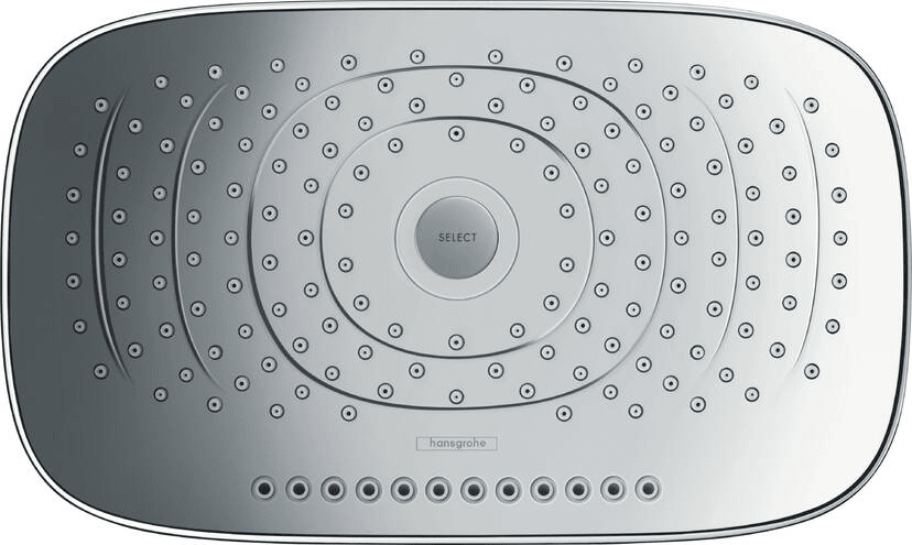 Верхний душ 300 3jet с держателем состоит из верхнего душа, держателя верхнего душа, размер душевого диска: 318 x 191 мм, тип струи: RainAir, Rain, RainStream, длина держателя для душа 390 мм, максимальный расход воды при давлении 3 бара: 22 л/мин, расход воды для струи Rain (при 3 бар): 18 л/мин, расход воды для струи RainAir (при 3 бар): 18 л/мин, расход воды для струи RainStream (при 3 бар): 22 л/мин, переключение потока между Rain и RainAir: кнопка выбора на верхнем душе, струя RainStream активируется кнопкой Select на термостате для 3 потребителей, поверхность душевого диска: хром или белый, материал душевого диска: металл, съемный душевой диск для очистки, монтаж: стена, скрытый монтаж с помощью iBox Universal. Есть вариант в бело-хромовом цвете - арт. 26468400