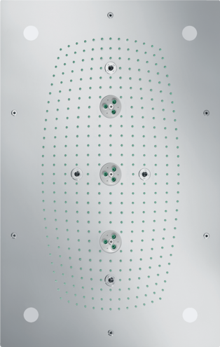 Верхний душ 680/460 3jet с подсветкой, размер душевого диска: 680 x 460 мм, тип струи: RainAir, Whirl, RainAir XL, максимальный расход воды при давлении 3 бара: 26 л/мин, расход воды для струи RainAir (при 3 бар): 20 л/мин, расход воды при режиме RainAir XL (при давлении 3 бар): 26 л/мин, расход воды для струи WhirlAir (при 3 бар): 22 л/мин, управление тремя зонами струй осуществляется посредством трех вентилей или одного переключающего вентиля с тремя ответвлениями, материал душевого диска: металл, монтаж: тип монтажа: вровень с потолком на базовом корпусе, соединительная резьба G со встроенным освещением, лампочка: LED, источник питания: 12 V - DC, трансформатор питания для скрытого монтажа 12 V. 18 мм, вход: 100 - 240 В AC / 50/60 Hz, выход: 12 V - DC, температура цвета: 2700 K, эффективность энергопотребления C.