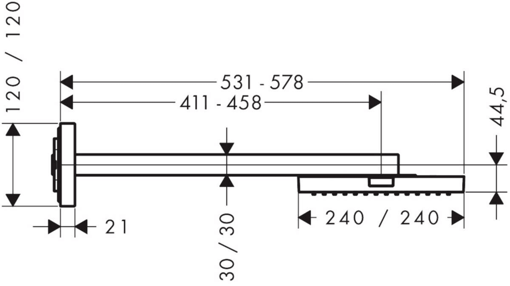 Верхний душ, розетка, размер душевого диска: 240 x 240 мм, тип струи: RainAir, длина держателя для душа металлический держатель для душа 411 – 458 мм, расход воды для струи RainAir (при 3 бар): 12 л/мин, расход воды с возможностью увеличения до 25 л / мин, материал душевого диска: металл, съемный душевой диск для очистки, монтаж: стена, не подходит для проточных водонагревателей. Есть варианты в разных цветах с полированной и шлифованной обработкой.