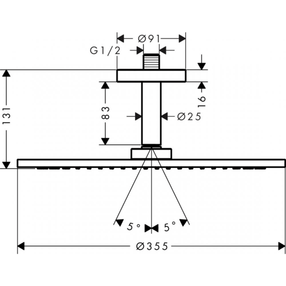 Верхний душ, размер душевого диска: 350 мм, полностью хромированный душевой диск, материал душевого диска: металл, съемный верхний душ для очистки, металлическое потолочное подсоединение, длина потолочного подсоединения: 100 мм, монтаж: потолок.