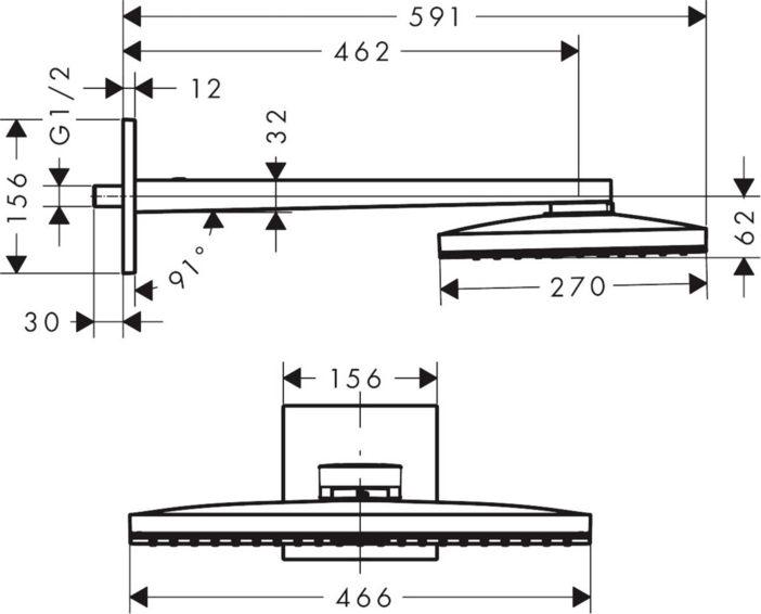 Верхний душ, розетка, размер душевого диска: 460 x 270 мм, тип струи: Rain, длина держателя для душа 460 мм, максимальный расход воды при 3 бар: 19 л/мин, расход воды для струи Rain (при 3 бар): 19 л/мин, материал душевого диска: металл, съемный душевой диск для очистки, съемный верхний душ для очистки, монтаж: стена, соединительная резьба G ½.